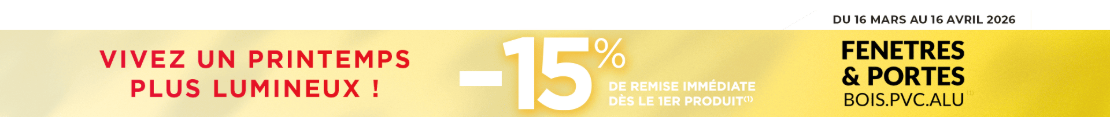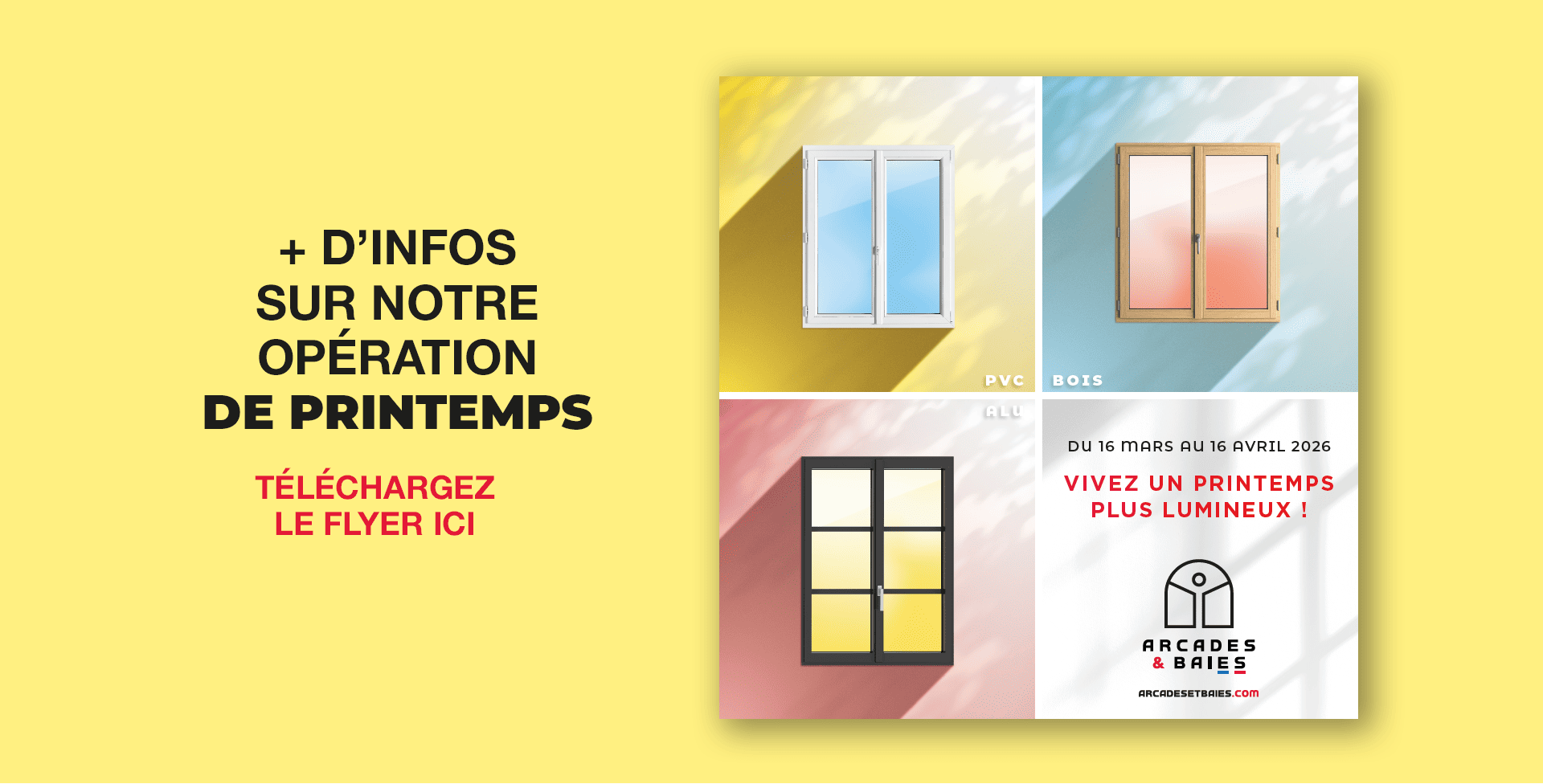 (1) Offre non cumulable, hors promotions antérieures, et sur fourniture seule. Offre valable pour toute commande passée entre le 16 Mars et le 16 Avril 2026 sur les gammes de menuiseries «Arcad’Lux» et «Arcad’éco» (bois, pvc et aluminium), sur la gamme «MGL» et sur toutes les portes d’entrée de la gamme